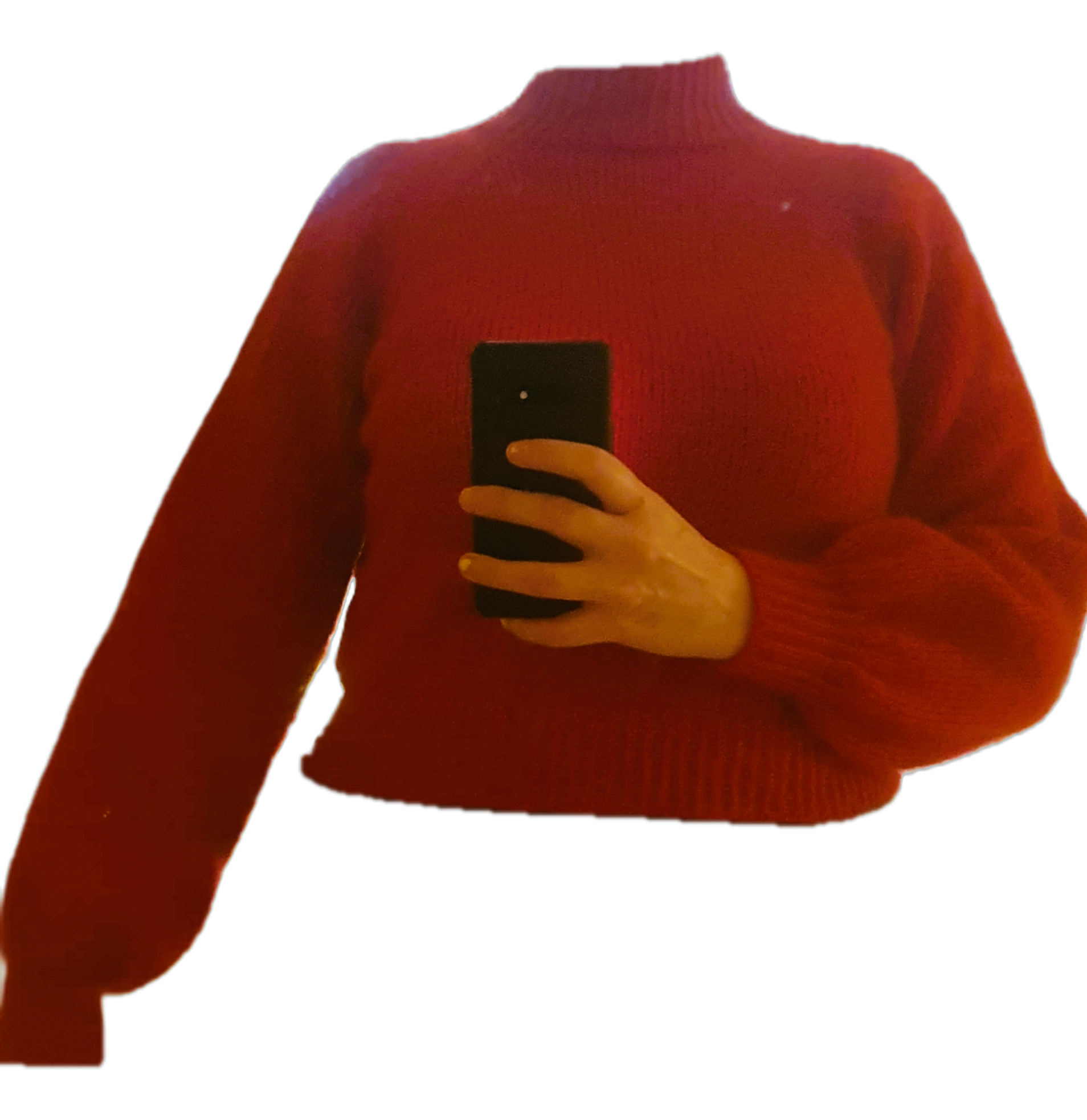 Eg brukte garnet som står i oppskrifta, men i andre fargar: Drops Alpaca i fargen 3650 (rødmelert) og … eg ser nå at eg IKKJE brukte Drops sin Kid Silk, men Merinor sin Kid Silk 🤭 i fargen 175 (rød). Rundpinne 4,5 til ribbestrikkingen og rundpinne 5 til alt det andre. Eg hadde ikkje vanlege pinnar i 5, så eg prøvde meg for fyrste gong med magic loop då eg strikka ermene, og det funka fett.